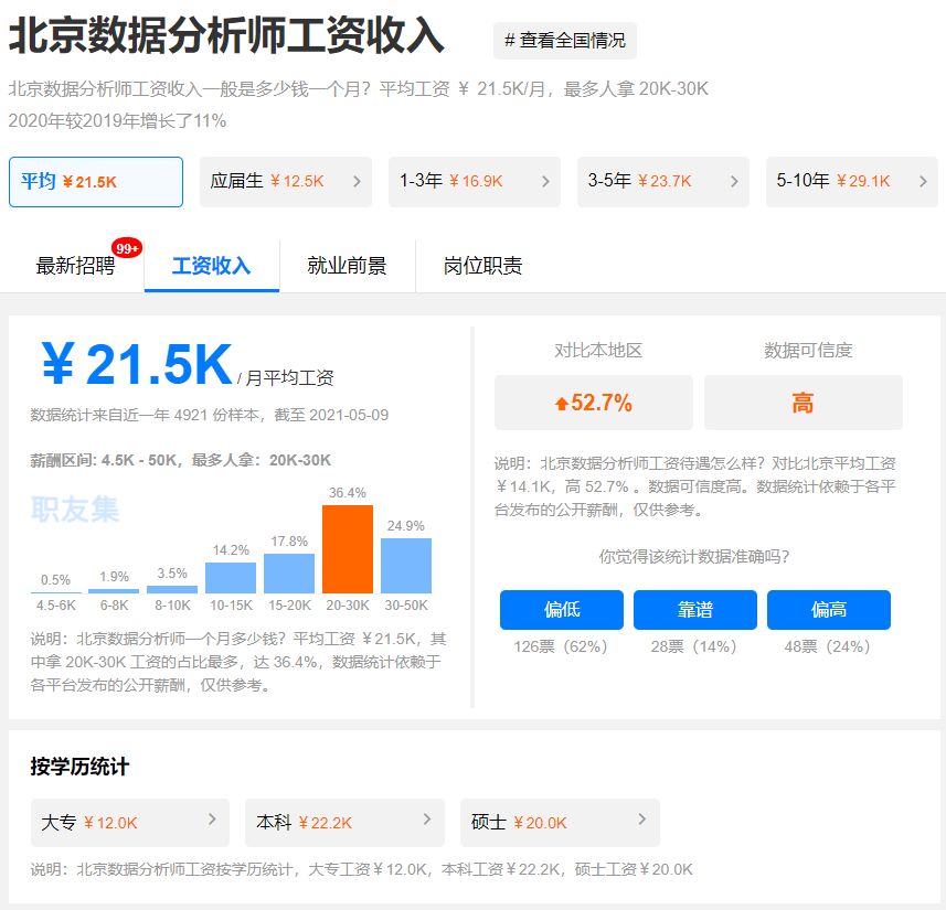 在职友集官网上可以查询到,如果按照工作经验统计,数据分析工程师的薪资水平逐年递增,经验越是丰富,薪资水平也会越高,应届毕业生薪资水平相对其他专业来说也是很有竞争力的。