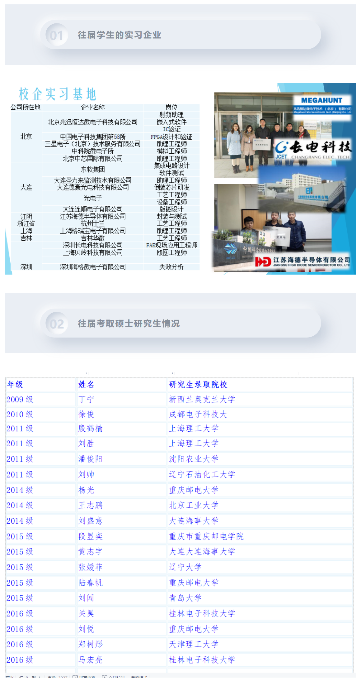 本专业拥有辽宁省唯一的微系统重点实验室,包括全套的微电子芯片制备大型设备、业内最先进的集成电路EDA工具、以及半导体器件与工艺虚拟仿真平台。能够完成半导体工艺实验、微电子芯片制备与测试、集成电路设计与验证、集成电路版图设计、数字集成电路设计、传感器测试、微机电系统测试、电子薄膜特性表征、新型半导体材料制备、半导体工艺及器件制备模拟、嵌入式系统等从底层到应用层的实践项目,学生实践内容的深度和广度都能得到很好的保证。同时,学生积极参加兴趣小组、社团和各种学科竞赛,如全国数学建模大赛、大学生电子大赛、飞思卡尔智能车竞赛、全国软件专业人才设计与创业大赛、蓝桥杯、挑战者杯竞赛等,近五年来,在各级各类学科竞赛或从中,累计获奖100余项省级以上竞赛奖励,发表学术论文12篇,申请软件著作权1项,申报国家实用新型专利1项,极大地提升了学生的实践能力和学习自信。