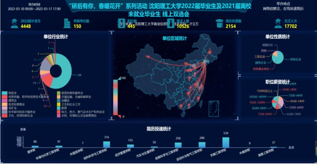 多方聚力促就业。面对疫情,招生就业处多方联络行业、企业、优秀校友资源,制定了“研后有你,春暖花开”系列活动方案,包含系列线上双选会、线上专场招聘会、兵工企业空中宣讲会、校友大讲堂等特色活动。已成功举办的系列活动之沈阳理工大学2022届毕业生及2021届离校未就业毕业生线上双选会,参会企业达150家,其中国有企业38家。提供岗位10526个,学生关注度达1.7万人次,参与投递简历2154份。后续学院专场线上双选会,即将于20日展开。