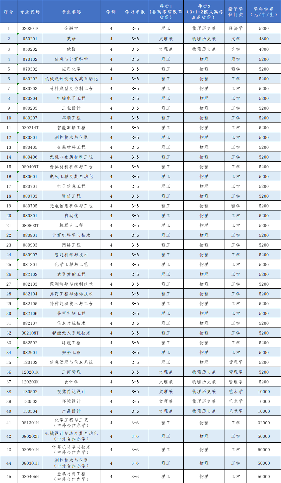 (1)奖学金:学校设有“国家奖学金”8000元/年、“省政府奖学金”8000元/年、“国家励志奖学金”5000元/年、“优秀学生奖学金”、“创新创业奖学金”、“兵工奖学金”、“校友奖学金”、“社会奖学金”等。