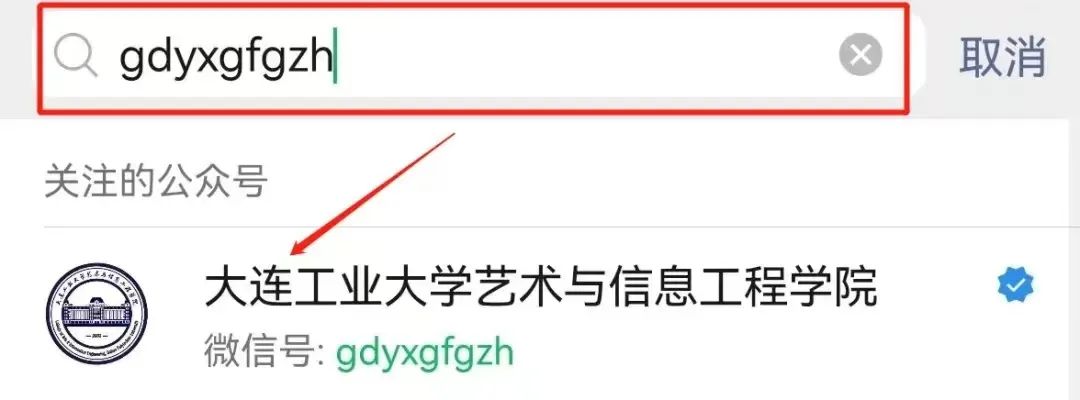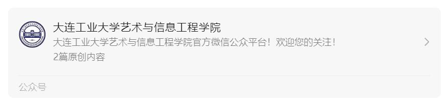 您可以在微信搜索公众号中搜索“大连工业大学艺术与信息工程学院”,或在微信搜索公众号中搜索官方微信号“gdyxgfgzh”,或直接点击下方公众号名片进行关注。让您实时掌握学校发布的招生信息。