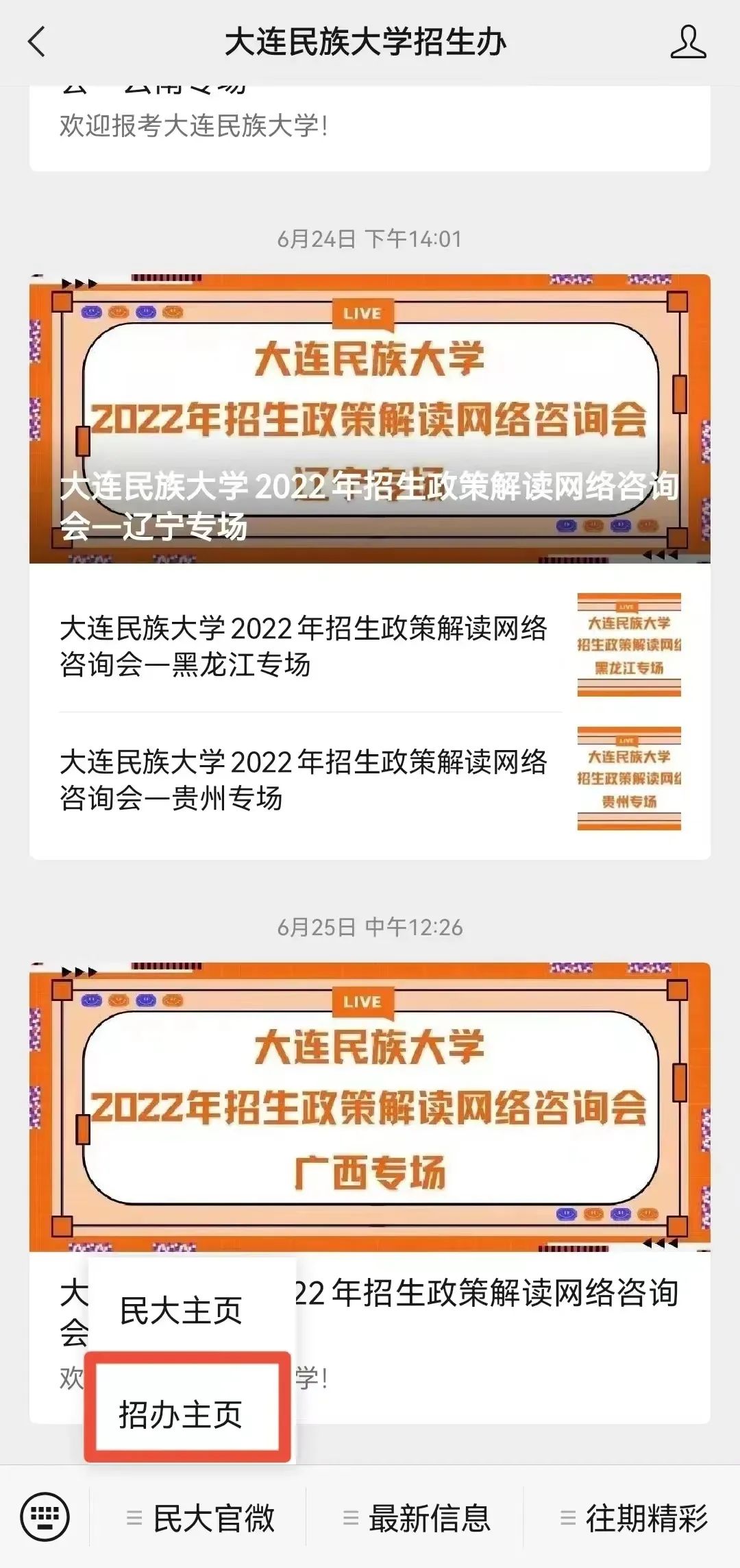 01.搜索并关注“大连民族大学招生办”微信公众号,点击左下角“民大官微”中的“招办主页”,即可进入招生微网