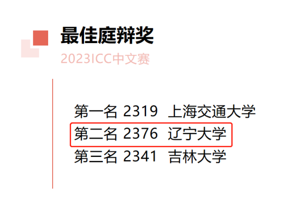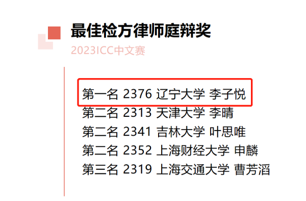 2023年4月15日至4月16日,2023年国际刑事法院中文模拟法庭比赛正赛庭辩第一轮和第二轮以线上比赛的形式通过腾讯会议顺利举行。2023年ICC中文赛共有来自全国各地的85支高校代表队参加,参赛队伍数量较再创历史新高。经过书状评审环节后,共45支代表队成功晋级正赛庭辩环节,经过两天庭辩环节的激烈角逐,辽宁大学法学院代表队以全国第1名的总成绩斩获ICC中文赛全国一等奖,以及最佳庭辩奖(第2名)、最佳检方律师奖(第3名)。同时,李子悦同学获得最佳检方律师庭辩奖(第1名)和检方律师十佳辩手(第1名)。这是辽宁大学ICC中文赛代表队自2018年第一次参赛以来,连续第六年获得全国一等奖。