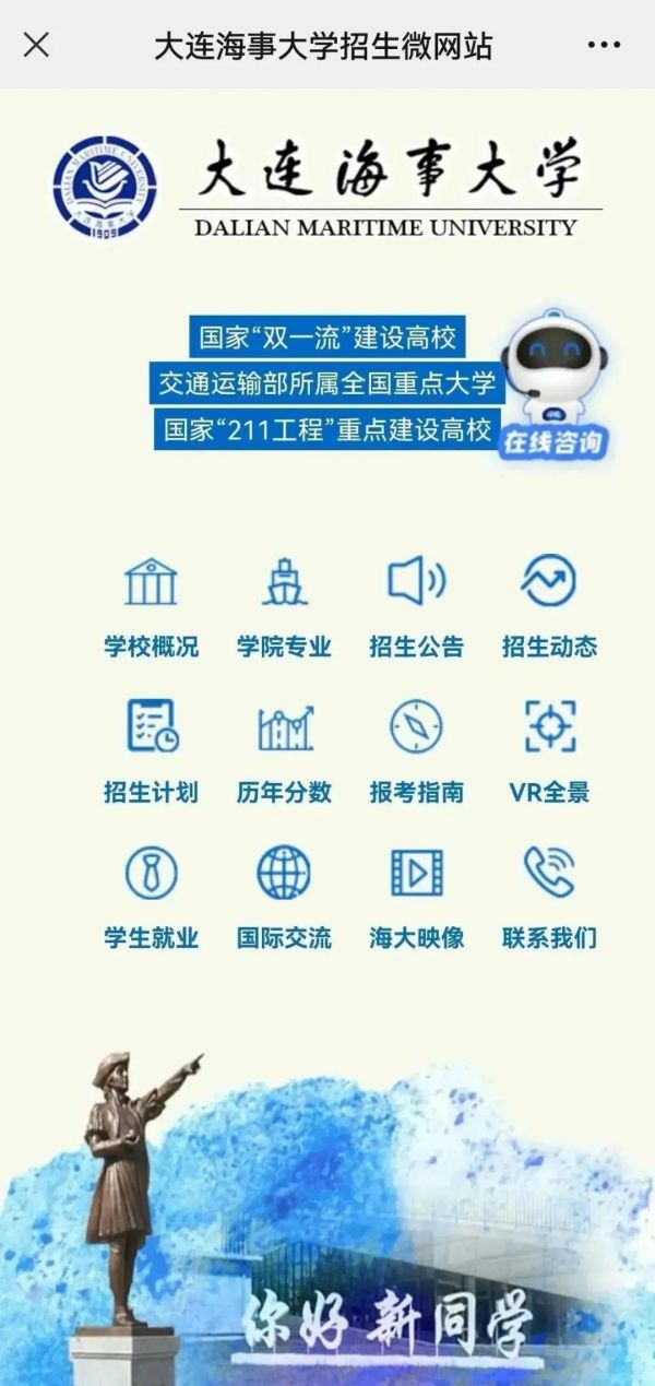 方式一:进入“大连海事大学本科招生办”公众号主页面,点击“招生门户”进入“招生微网站”。点击“在线咨询”,填写并提交高考生源地等基础信息即可进行咨询。