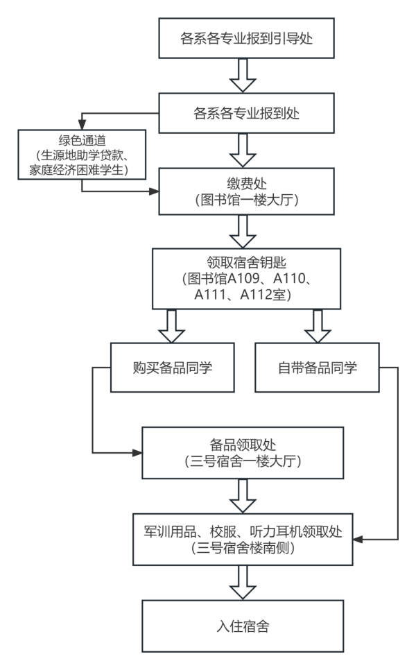 学校在南正门设立各系各专业的“新生引导处”,届时会有老师、志愿者带领新生至各系各专业“新生报到处”,进行查验录取通知书、发放“新生报到流程表”(见下图)、一卡通等事项;完成报到处相关事项后,携带相关材料至图书馆一楼大厅缴费处缴费;缴费结束后至图书馆(A109、A110、A111、A112室)领取宿舍钥匙;领取宿舍钥匙结束后:1.购买备品的同学请至三号宿舍一楼大厅备品领取处领取备品,结束后请至三号宿舍楼南侧领取军训用品、校服、听力耳机,以上流程结束后,即可入住寝室;2.自带备品同学请至三号宿舍楼南侧领取军训用品、校服、听力耳机,以上流程结束后,即可入住寝室!温馨提示:已办理生源地信用助学贷款的同学报到处完成报到注册后,请携带报到处相关材料(含《贷款受理证明》)至绿色通道(生源地助学贷款)办理处,结束后再到缴费处办理缴费,其他事项按照正常流程依次办理并入住宿舍。
