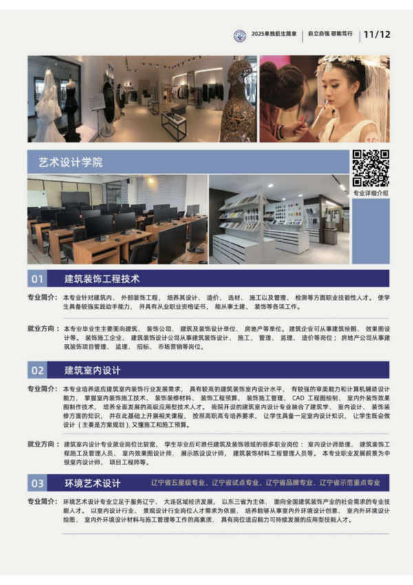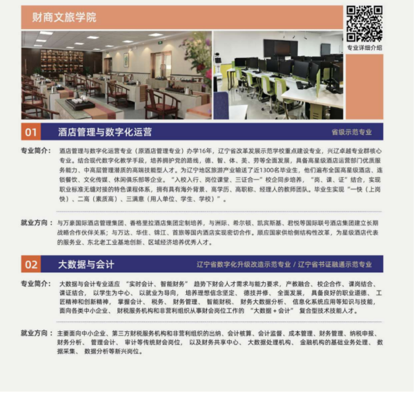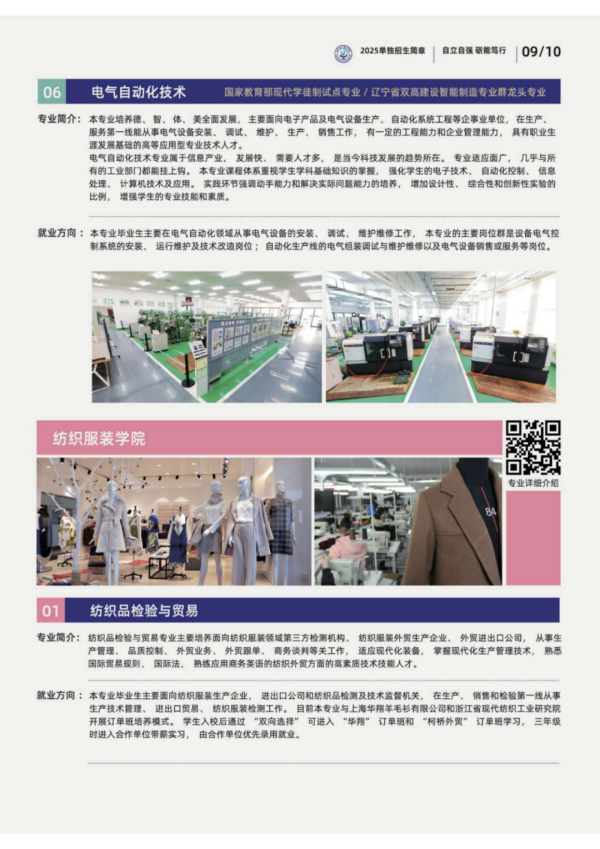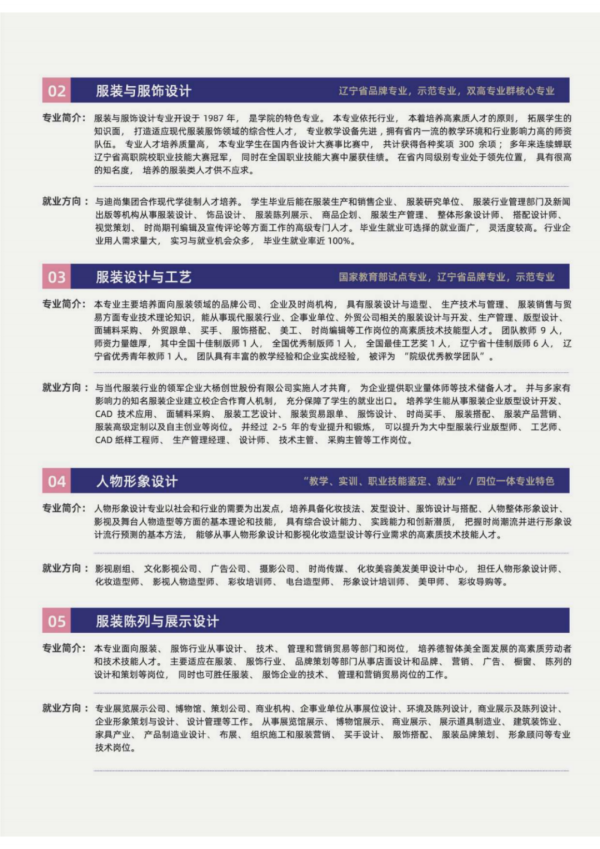 学校现有七院二部,即纺织服装学院、艺术设计学院、财商文旅学院、航空运输学院、信息工程学院、智能制造学院、马克思主义学院、基础教学部、体育部。开设艺、文、工、管四大类37个专业,已形成纺织服装类艺术创意类、现代服务类、电子信息类、先进制造类五大专业群。其中现代纺织服装专业群、智能制造专业群被批准为辽宁省高水平特色专业群立项建设项目。服装设计与工艺、机械制造与自动化、服装与服饰设计三个专业被认定为高等职业教育创新发展行动计划骨干专业。服装设计与工艺专业被评为国家级高等职业教育试点专业。服装与服饰设计专业获批辽宁省现代学徒制人才培养模式改革示范专业。环境艺术设计专业和酒店管理与数字化运营专业获批辽宁省“订单、定制、定向”人才培养模式改革示范专业。服装与服饰设计、服装设计与工艺、数字媒体艺术设计、环境艺术设计、数字媒体技术、计算机网络技术、数控技术、酒店管理与数字化运营等8个专业被评为辽宁省高等职业教育示范或品牌(特色)专业,这些专业在省内同类院校中处于领先地位,具有较高的影响力。