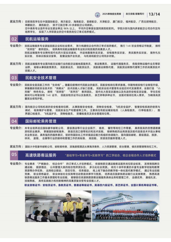(一)空中乘务、民航运输服务、国际邮轮乘务管理、民航安全技术管理、高速铁路客运服务等专业录取办法。
