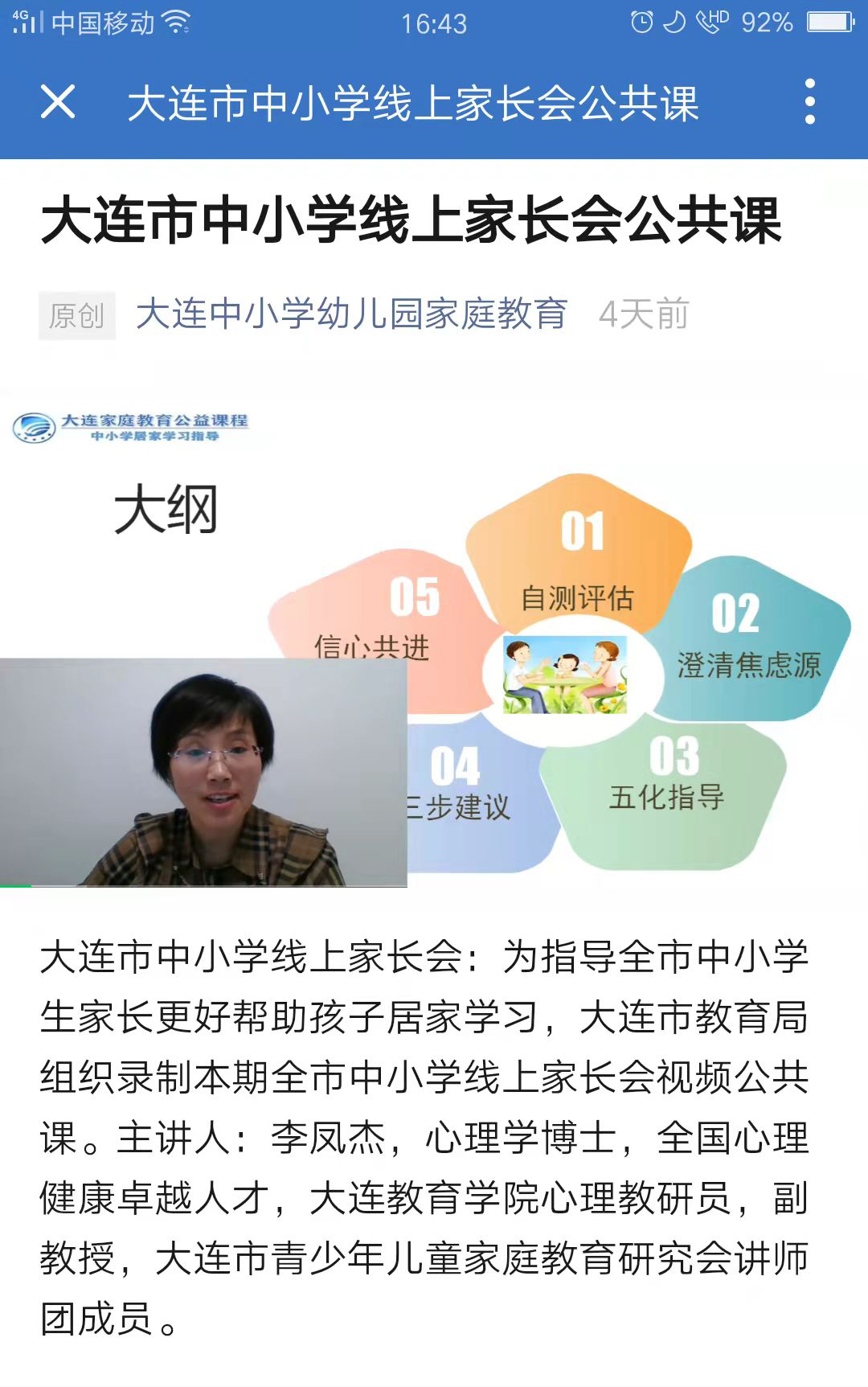 会上,学校为家长们播放了“全市中小学生居家学习公共课”,为指导全市中小学生家长更好帮助孩子居家学习,大连市教育局组织录制本期全市中小学线上家长会视频公共课。主讲人李凤杰是全国心理健康卓越人才、大连教育学院心理学博士、大连市青少年儿童家庭教育研究会讲师团成员。家长们观后纷纷称赞,感悟颇深。