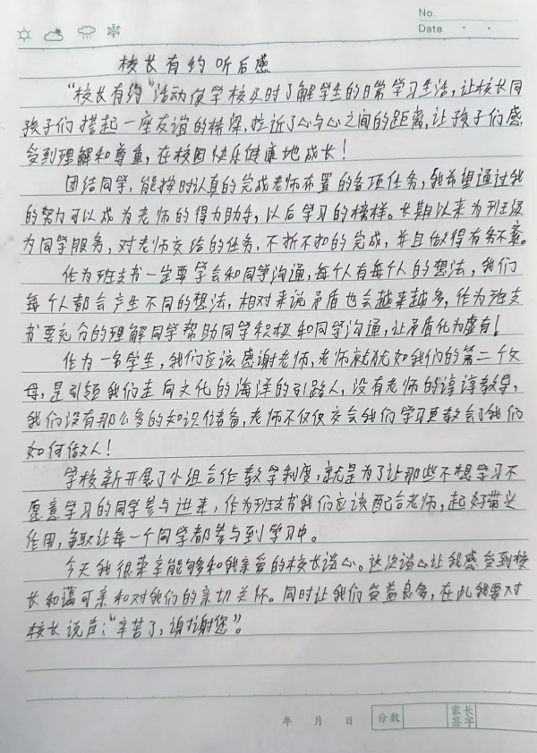 自王彪老师担任北方工业学校校长以来,每周一次的“校长有约”已经坚持了三年。新学期第一次校长有约在2023年3月12日举办。本次适逢中央两会召开。王彪老师以“习语演讲团导师”身份深入班级调研,认真倾听了十三个班级的团支书、班长分享的班级管理经验。