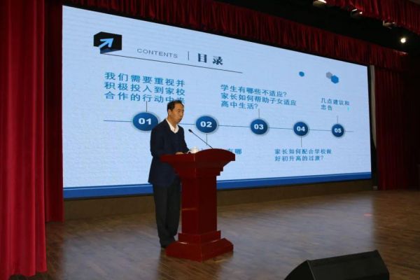 张德忠老师为家长们做了题为《携手助力我们的孩子们尽快适应高中生活》的精彩报告。报告中指出,高中是大学的摇篮,是一个人一生中最美好的时期,也是学习知识最紧张的时期。从初中升入高中是学生人生道路上的一次飞跃,也是学习生活的一次跨越。初入高中,学生在学习和生活上都会遇到许多意想不到的困难,能否做好初中到高中阶段的过渡、衔接,直接关系到学生能否顺利地适应高中的学习和生活。