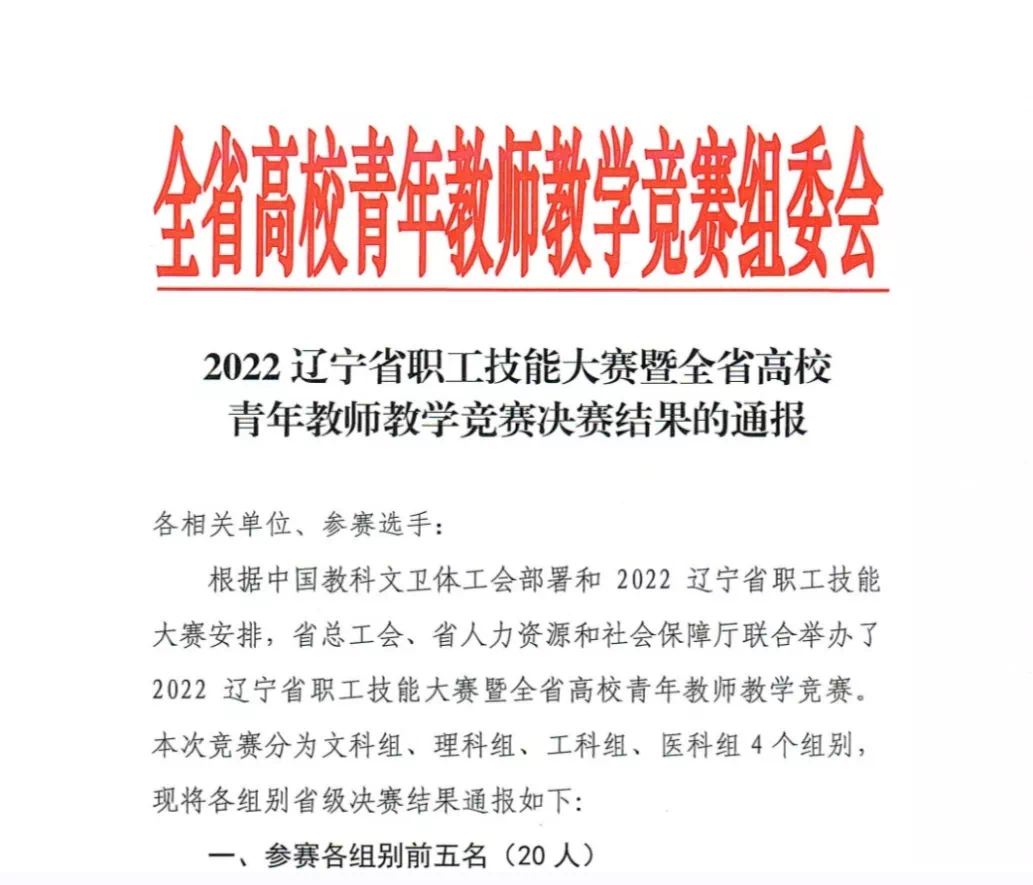 2022年12月12日-13日,辽宁省总工会、辽宁省人力资源和社会保障厅联合举办了2022辽宁省职工技能大赛暨全省高校青年教师教学竞赛线上决赛。辽宁医药职业学院青年教师王莉楠获医科组第五名。