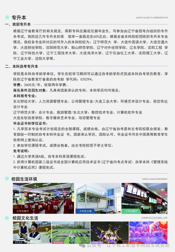 高校名称:辽宁轻工职业学院办学地点及校址:航空运输学院、智能制造学院、信息工程学院、艺术设计学院、纺织服装学院所有专业在金州校区就读,金州校区办学地点为:辽宁省大连市金州区金港路288号。财商文旅学院所有专业(酒店管理与数字化运营、大数据与会计、连锁经营与管理、休闲服务与管理、移动商务、跨境电子商务、市场营销、旅游管理、休闲体育)大一新生在开发区校区就读。开发区校区办学地点为:辽宁省大连市金州区东北三街26号。办学类型:普通高等学校(公办)办学层次:高职专科办学形式:全日制