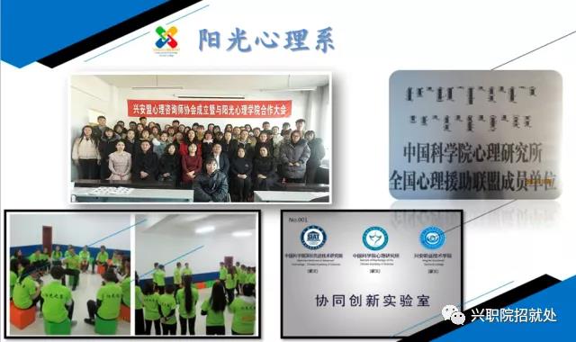 阳光心理系是目前国内第一家探索心理健康教育与体验教育结合的院系,是内蒙古自治区首批评为大学生心理健康教育与咨询示范中心的院系,是内蒙古各高职院校中最早设罝心理咨询专业也是唯一所设立心理咨询专业并完成招生计划的院系。我系专业设置适应社会发展趋势,探索心理咨询与社会工作优势专业,并积极进行专业群建设。我院积极拓展对外交流合作空间,联合中科院心理研究所创建了协同创新实验室——“心理梦工厂”,实验基地内设有国内最为领先的教学实验设备,建有自我探索区、沟通协作区、成长体验区和身心减压区。联合国家体验教育的领军培训机构——北京亮剑开拓文化发展有限公司合作建立体验教育基地。与兴安盟人民医院、兴安精神康复医院、兴安盟精神卫生中心建立一体化合作。