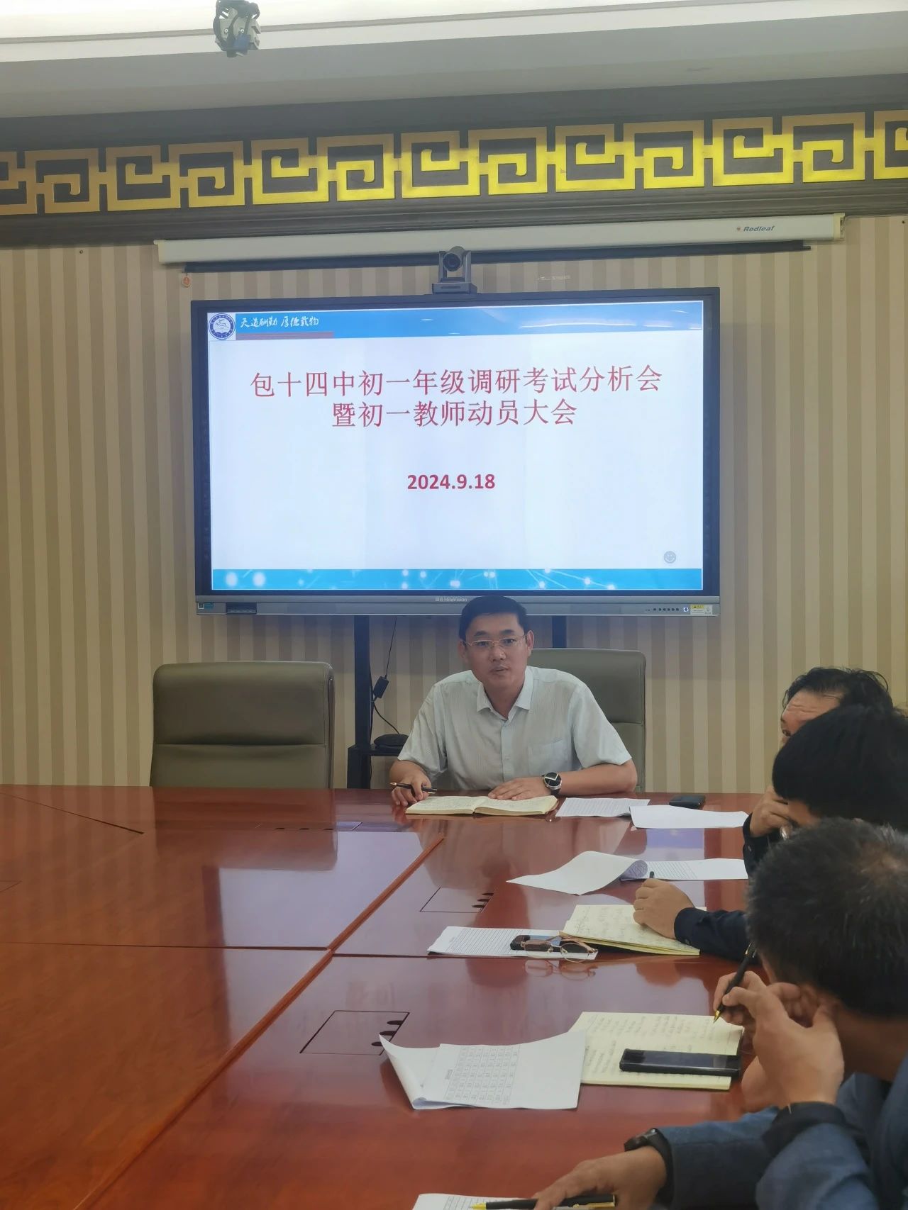 叶落虽秋去,冬阳照云窗。子衿当勤勉,莫负好时光。为全面部署新学期初一年级教育教学工作,包头市第十四中学于9月18日下午在行政楼五楼会议室召开初一年级调研考试分析会暨初一年级教师动员大会。学校校长孟峰、副校长乌兰哈达、教务处主任朱理军、教务处副主任才音德力根出席会议,教务处负责人王海鹤主持会议,全体初一年级教师参加会议。