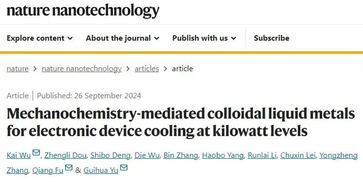近日,四川大学高分子科学与工程学院傅强教授/吴凯副研究员团队联合美国德克萨斯大学奥斯汀分校,开发出了一种新型热界面材料一一胶体状液态金属,以应对这一挑战。他们通过机械化学的方法制备了一种液态金属/氮化铝胶体,该材料表现出卓越的导热性能和触变性,显著降低了固-固界面的热阻,缩小了现有TIMs与理论之间的差距。经测试,这种胶体的热阻仅为0.42-0.86mm2K/W,远超当前领先的导热材料的性能。在结合微通道冷却系统的测试中,这种胶体能够从16平方厘米的热源中提取2760瓦的热量,同等条件下相比最先进的硅脂可以减少65%的泵电力消耗,为千瓦级设备的可持续冷却提供了新方案。这一研究成果以“Mechanochemistry-mediated colloidal liquid metals for electronic device cooling at kilowatt levels"为题,发表在《Nature Nanotechnology》期刊上。吴凯副研究员(德克萨斯大学奥斯汀分校访学者),博士生窦正力、邓世博为共同第一作者,吴凯副研究员、傅强教授和德克萨斯大学奥斯汀分校余桂华教授为共同通讯作者。