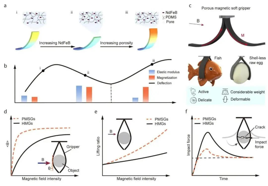 这种将多孔结构引入磁性硅胶弹性体制造抓手的方法,使抓手具备高磁化、低模量和粗糙表面的特点,使其在保持强大抓取力的同时,也能够适应各种不同的场景,展现出柔软与速度的完美平衡。