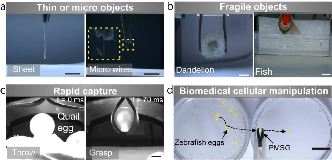 软体抓手的多功能性展示:(a)抓取薄板和细线;(b)抓取鱼和蒲公英;(c)抓取去壳生蛋;(d)安全移取斑马鱼卵。