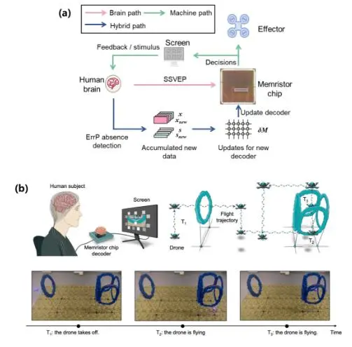 (a)脑-忆阻器交互式更新框架;(b)基于忆阻器脑电解码的实时脑控无人机飞行。