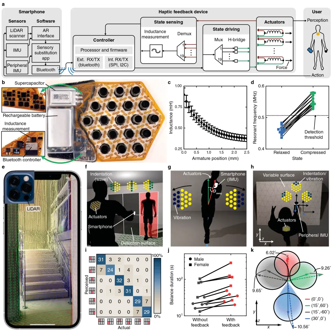 经过人体测试实验(见图3),确切地证明了以下几点:首先,通过智能手机的LiDAR技术感知前方障碍物,并与触觉皮肤电子器件协同工作,能够为视力障碍者提供精确且可靠的导航指引(见图3f)。其次,利用智能手机内置的惯性测量单元(IMU)实时监测用户的身体姿势变化,并与触觉皮肤电子器件相结合,可以为用药后等平衡感受损的患者提供平衡感官替代方案(见图3g)。最后,通过IMU精准追踪脚步的方向以及与地面的相对角度,配合触觉皮肤电子器件,可以辅助糖尿病脚部感官缺失的患者调整步态,有效预防跌倒,从而实现对其脚部感官功能的精准替代(见图3h)。