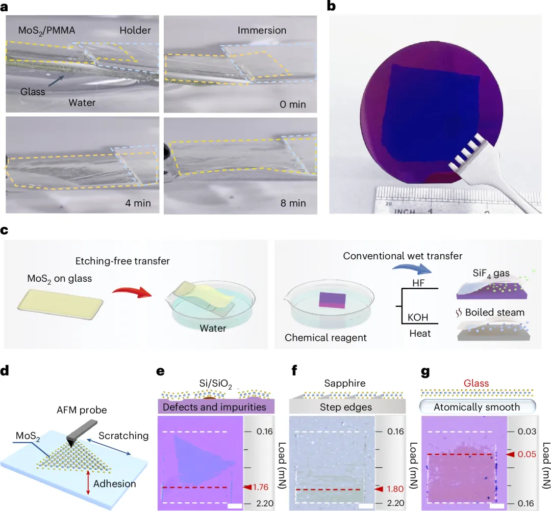 大面积MoS2薄膜的转移:利用去离子水的表面张力,MoS2薄膜可以自发剥离,无损且高效率地成功大面积转移到2英寸硅片上。这一方法利用薄膜和衬底见的弱界面耦合特性,无需使用任何蚀刻溶液,从而显著减少了对化学试剂的依赖,并避免了传统方法可能带来的薄膜损伤。MoS2薄膜与衬底之间的附着力越强,薄膜在外力作用下越难以被切开。通过AFM纳米划痕测试量化了MoS2与基材之间的附着力,结果表明2DCZ生长在玻璃基板上的MoS2附着力最弱(0.05mN),显著低于传统CVD生长在其他衬底如硅(1.76mN)和蓝宝石(1.80mN)。这一温和高效的转移方法为大面积单层二维半导体材料的完整转移提供了新思路,有望促进其在集成中的应用。