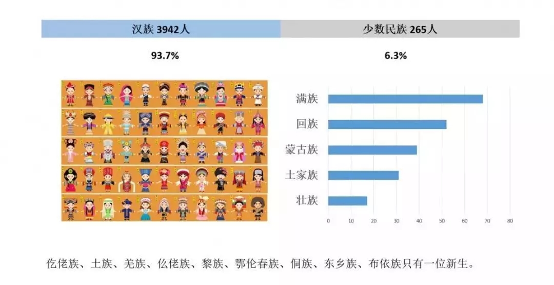 在今年,我们又迎来了许多少数民族的同学。2019级全日制研究生新生中,汉族学生占3942人,少数民族265人。而在少数民族中,