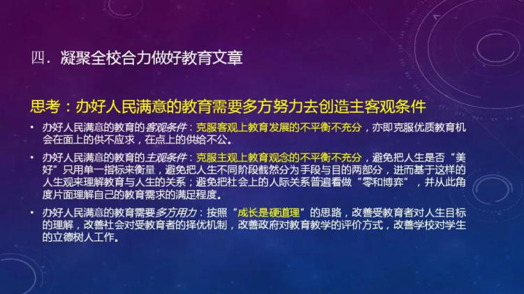 童世骏认为,教育的质量和方向必须在更高水平上更紧密地统一起来,办好人民满意的教育需要多方努力去创造主客观条件。他指出,就客观条件而言,克服客观上教育发展的不平衡不充分,亦即克服优质教育机会在面上的供不应求,在点上的供给不公。就主观条件而言,克服主观上教育观念的不平衡不充分,避免把人生是否“美好”只用单一指标来衡量;避免把人生不同阶段截然分为手段与目的两部分,进而基于这样的人生观来理解教育与人生的关系;避免把社会上的人际关系普遍看做“零和博弈”,并从此角度片面理解自己的教育需求的满足程度。办好人民满意的教育需要多方用力,按照“成长是硬道理”的思路,改善受教育者对人生目标的理解,改善社会对受教育者的择优机制,改善政府对教育教学的评价方式,改善学校对学生的立德树人工作。