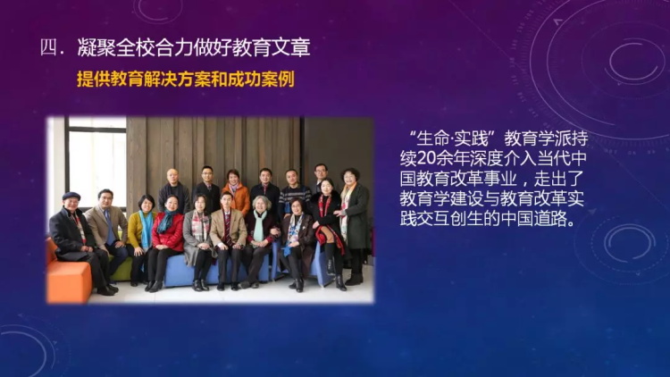 在这个大的历史背景之下,结合华东师大从1951年创校开始,在教育领域所进行的卓有成效的探索,以点带面,回顾了作为新中国第一所社会主义师范大学的华东师大在探索教育思想更新、参与教育规划和标准制定、推动学校转型变革、引领课程教学改革、助力教师专业发展、聚焦重大问题攻关、提供管理决策服务、指导附中卓越发展、承担教育合作帮扶、支持本校教改创优等方面取得的重要成绩。