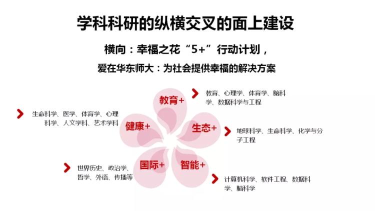 就华东师大而言,作为一所具有浓厚爱国情怀的大学,作为新中国成立后组建的第一所社会主义师范大学,“爱在华师大”的愿景,就是要通过对“幸福之花”的浇灌和培育,来为全社会提供幸福解决方案。为此,华东师大确立了“育人”“文明”“发展”三大使命,借助学科交叉、信息化(智能化)、国际化三大手段,通过教育教学创新引领工程、学科优化提升工程、国家战略精准对接工程等发展路径,逐步实现建成世界一流大学的发展愿景。