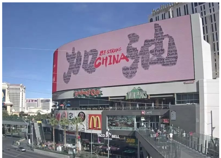 蓝色光标在美国纽约和拉斯维加斯的三块地标大屏幕上投放“加油,China”巨幅画报