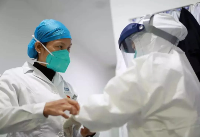 ▲在武汉医院里随时待命的梁玉婵(右一)