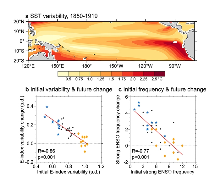 图:初始的随机微小扰动会导致同一气候模式模拟出完全不同的厄尔尼诺演化过程(类似于“蝴蝶效应”)。在全球变暖使得厄尔尼诺变率增大的大前提下,若起始阶段厄尔尼诺事件较为活跃(橘黄色菱形符号),即变率较大(b),发生频率较高(c),那么在将来变暖情景下该实验中厄尔尼诺变率的增加较少,反之亦然(蓝色五角星符号)