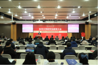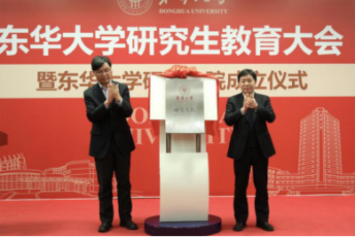 12月31日,东华大学研究生教育大会暨东华大学研究生院成立仪式在延安路校区举行。党委书记刘承功、校长俞建勇共同为东华大学研究生院揭牌。党委副书记刘淑慧、崔运花,党委副书记、纪委书记王云骏,副校长邱高、陈革、舒慧生、李炜出席会议;上海市学位委员会办公室主任束金龙,复旦大学研究生院常务副院长陈焱,南京大学党委常委、研究生院常务副院长周济林,同济大学研究生院院长黄宏伟等应邀参会;各学院、部处负责人,研究生督学组专家以及师生代表150余人与会。会议由舒慧生主持。