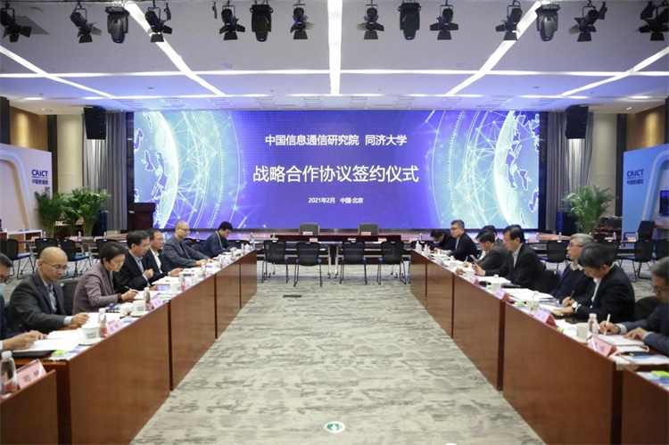 签约仪式在中国信息通信研究院举行。中国信息通信研究院院长余晓晖、副院长王志勤、总工程师胡坚波,同济大学校长陈杰,副校长顾祥林、童小华等出席签约仪式。王志勤、顾祥林分别代表双方签署协议。