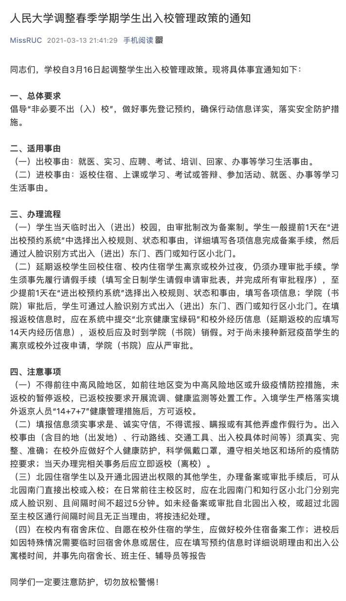 中国人民大学3月13日消息,学校自3月16日起调整学生出入校管理政策。