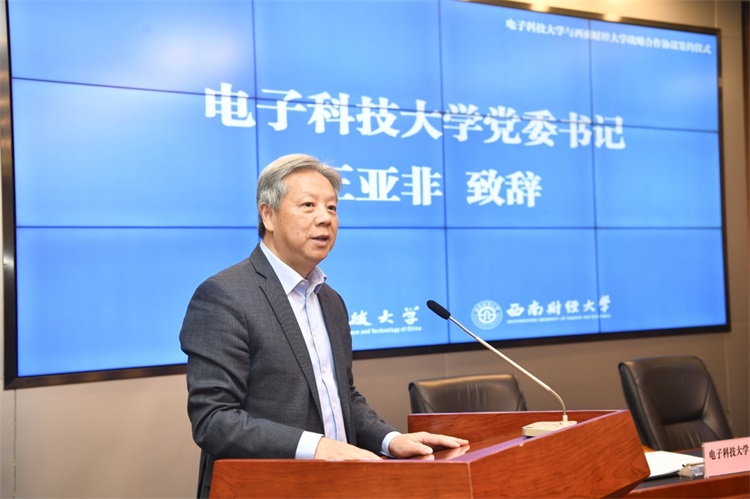 王亚非代表学校感谢西南财大长期以来对电子科大的关心、帮助和支持,赞赏西南财大建校以来在金融、经济、管理等高层次人才培养方面取得的突出成绩。他表示,签署战略合作协议对双方未来发展具有重要意义。进入新发展阶段,双方要分析面临的机遇和挑战,充分发挥各自优势,既在自身擅长的领域培养更多创新引领性人才,又在多学科交叉融合中提升学生的综合素养,帮助两校学子更好地成长为德智体美劳全面发展的社会主义事业建设者和接班人。当前,多学科交叉融合已成为实现创新的主要途径,金融和电子信息的交叉融合将在未来科技创新中发挥独特作用,双方要携手努力,走出一条多学科交叉融合的创新之路,为国家实现高水平自立自强作出更大贡献。作为行业特色型大学,双方要在保持优势特色的同时,进一步优化学科生态,通过强强合作、抱团取暖、取长补短,突破西部地区高校资源禀赋相对不足的瓶颈,在新起点上更好地推进“双一流”建设。希望双方接下来落实好协议内容,不断拓展合作层次,丰富合作内涵,推动战略合作结出丰硕成果。