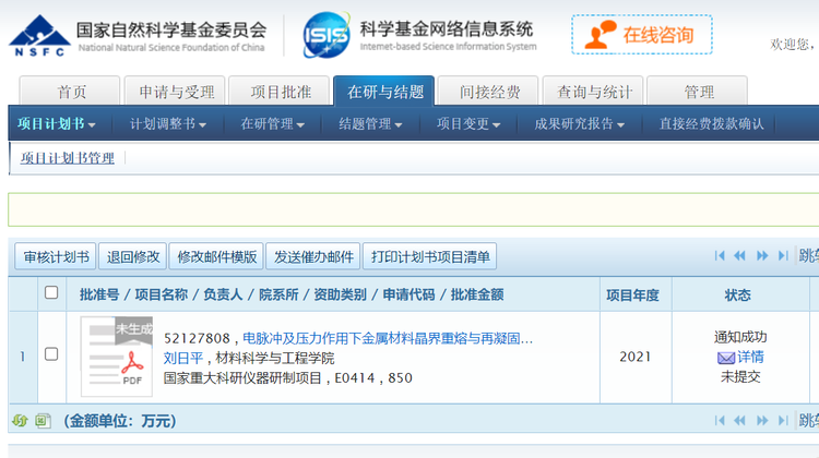 近日,由燕山大学刘日平教授主持申报的国家重大科研仪器研制项目“电脉冲及压力作用下金属材料晶界重熔与再凝固装置”正式获得国家自然科学基金委员会立项资助,项目直接经费850万元。这是燕山大学首次获批主持国家自然科学基金国家重大科研仪器研制项目,是学校取得的又一项重大科研历史性突破。