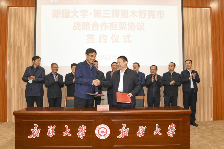 2月11日,新疆大学与兵团第三师图木舒克市签署战略合作框架协议。大学党委书记许咸宜与兵团第三师党委书记、政委李震国一行举行座谈并签约。大学党委副书记、校长姚强主持会议并介绍学校基本情况。