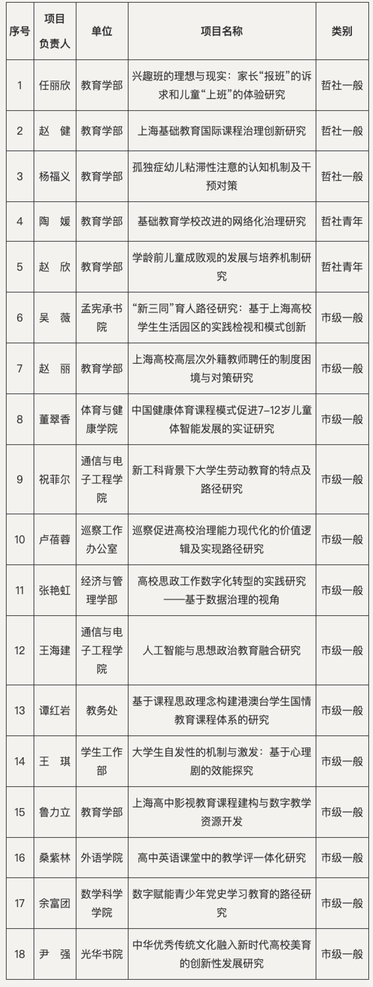 此次全市共立项15项上海市哲学社会科学规划教育学一般项目、5项上海市哲学社会科学规划教育学青年项目、413项上海市教育科学研究一般项目。