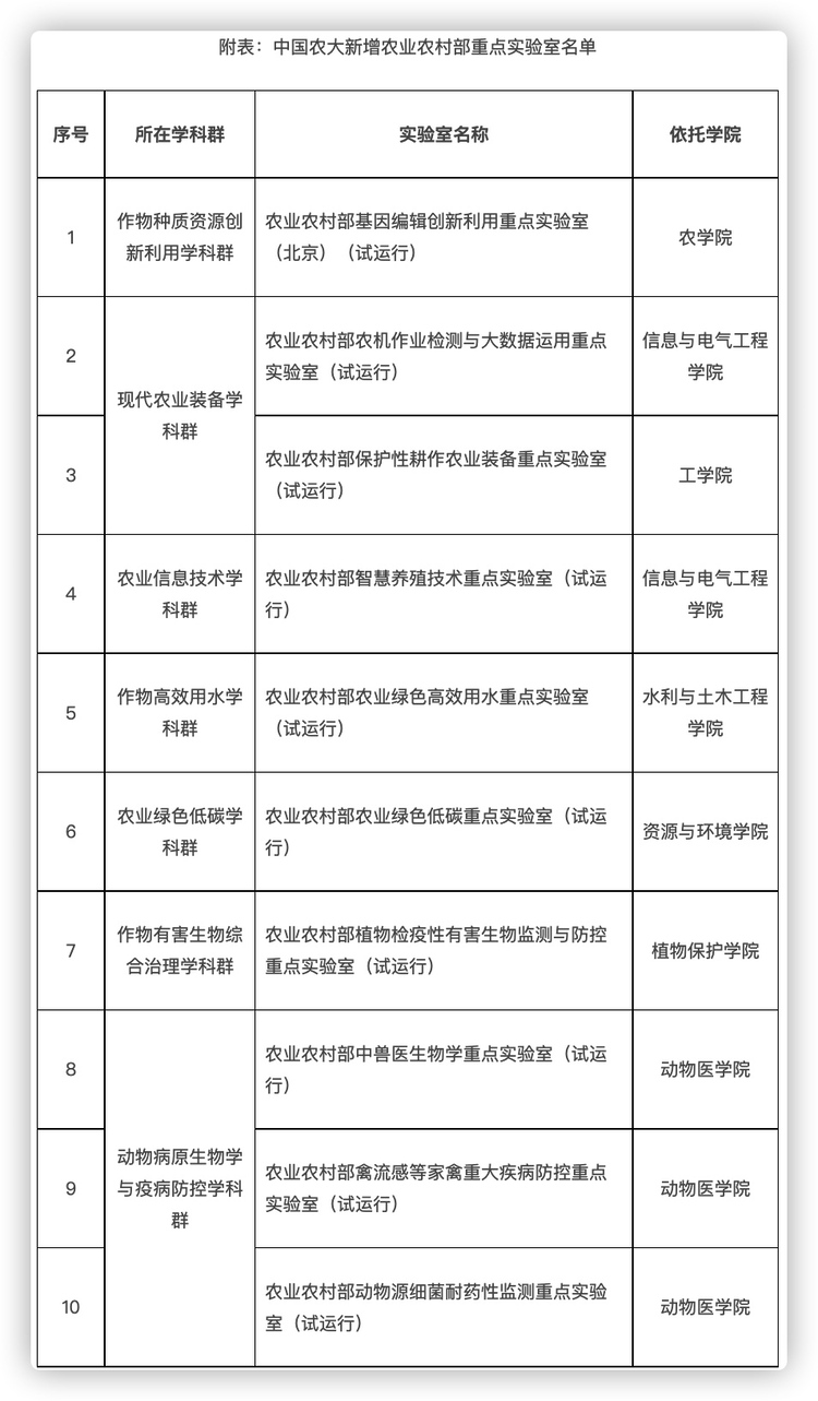 农业农村部正式发文,公布“十四五”农业农村部学科群重点实验室名单,中国农大新增10个农业农村部重点实验室,分别为农业农村部基因编辑创新利用重点实验室、农业农村部农机作业检测与大数据运用重点实验室、农业农村部保护性耕作农业装备重点实验室、农业农村部智慧养殖技术重点实验室、农业农村部农业绿色高效用水重点实验室、农业农村部农业绿色低碳重点实验室、农业农村部植物检疫性有害生物监测与防控重点实验室、农业农村部中兽医生物学重点实验室、农业农村部禽流感等家禽重大疾病防控重点实验室、农业农村部动物源细菌耐药性监测重点实验室,其中“农业绿色低碳重点实验室”是“农业绿色低碳学科群”的综合性实验室。截止目前,学校共有农业农村部学科群重点实验室40个,包括4个综合性实验室。