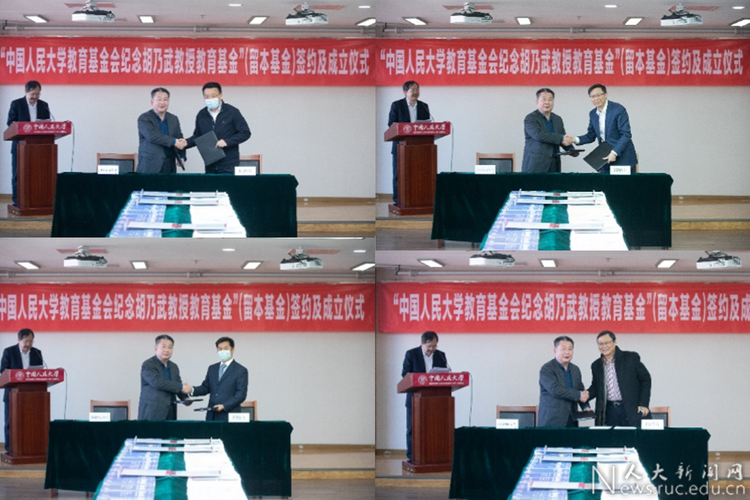 3月31日下午,“中国人民大学教育基金会纪念胡乃武教授教育基金”(留本基金)签约及成立仪式举行。中国人民大学副校长刘元春,副校长、教育基金会副理事长杜鹏,原党委常务副书记、教育基金会常务副理事长张建明,捐赠人胡乃武学生代表、中国人民大学原副校长、一级教授吴晓球等出席仪式;捐赠人胡乃武学生代表、原经济学院院长、一级教授杨瑞龙,北京天象星云私募基金管理有限公司董事长郭柏春,北京君业投资基金管理有限公司董事长彭俊明,上海陇惟实业有限公司法定代表人、中诚信国际信用评级公司董事长闫衍,中国人民大学劳动人事学院教授彭剑锋,中国人民大学商学院教授齐东平,北京师范大学教授董藩,银河投资公司原董事长许国平,中诚信国际信用评级有限责任公司副总裁薛东阳,中国国投高新产业投资有限公司党委书记、董事王培等以及学校教育基金会秘书长郭海鹰,校友工作办主任、教育基金会副秘书长周荣,应用经济学院院长郑新业等参加活动。仪式由经济学院党委书记、院长刘守英主持。