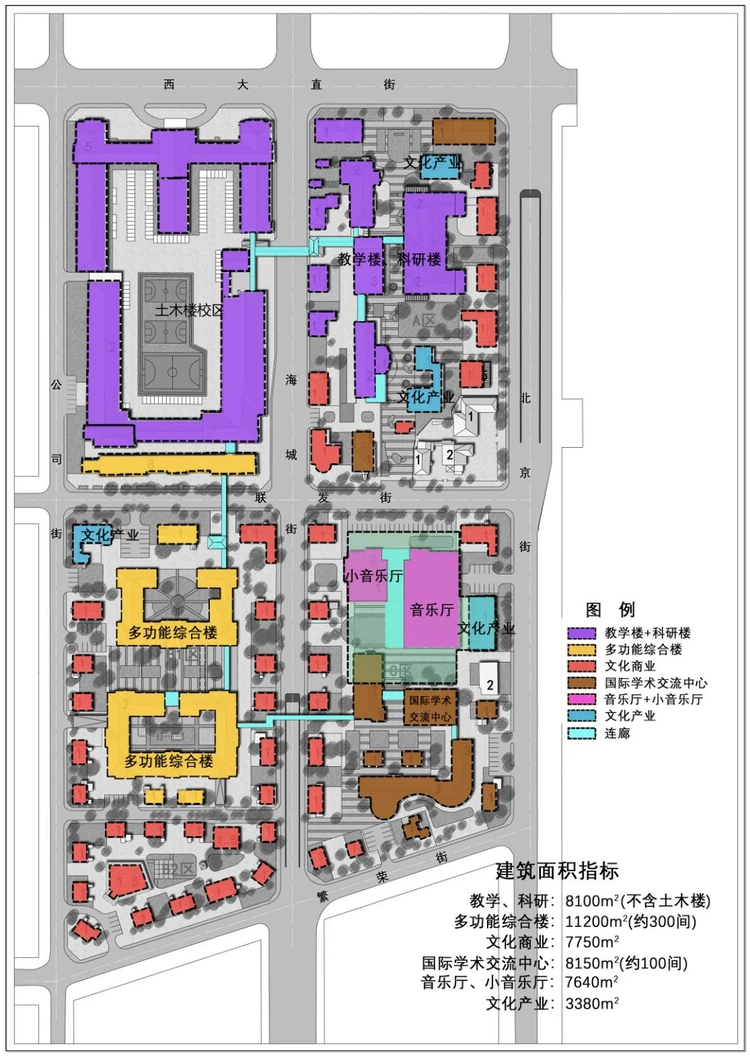 在功能分区上,中俄联合校园将和土木楼联合规划,功能互补, A、B区布置教学区、多功能综合楼,C区布置文化艺术中心和国际交流中心,文化艺术中心含有800个座位的多功能音乐厅和300个座位的小音乐厅。