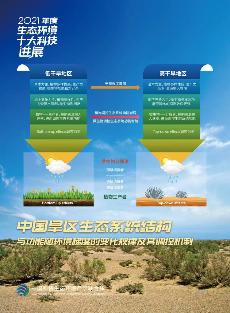 研究团队历时8年对我国旱区典型生态系统进行了大尺度野外调查,收集了20000余份样品,结合室内实验和理论建模与模拟分析等研究手段,取得了以下系列研究成果:(1)创新性地整合代谢生态理论、植物异速生长理论和植物竞争理论等,推导并建立了木本植物生物量分配的一般性理论模型;(2)发现木本和草本植物根茎叶元素含量及化学计量比等功能性状均在干旱与半干旱区分界线(即干旱指数0.2)发生了明显转变现象,草本植物可作为干旱梯度上植物功能性状变化的负指示物种,而木本植物可作为干旱梯度上的正指示物种;(3)解析了从末次间冰期到现在及未来的2070年,不同生活型植物多样性的时空动态格局及其形成机制,发现水热因子联合调控了木本和草本植物多样性,且山地或山盆体系的植物多样性对气候变化最敏感;(4)厘清了土壤微生物多样性及生态系统多功能性的空间变化规律,发现土壤细菌和真菌多样性及生态系统多功能性沿干旱梯度均呈非线性变化趋势,且生态系统多功能性对干旱胁迫的响应比单个功能性状更加敏感;(5)构建了环境胁迫-生物多样性-生态系统功能间的耦合关系及作用机制,创新性地提出了植物和土壤微生物多样性对生态系统多功能性的调控分别遵循bottom-up和top-down调控原理,且该调控模式将沿干旱梯度发生转变的理论假说,并得到了大量野外调查和室内控制实验的有效验证,首次发现生物多样性对生态系统多功能性的调控机制将沿干旱与半干旱区分界线(即干旱指数0.2),由半干旱和干旱半湿润区以植物多样性调控为主的bottom-up调控模式转变为干旱与极旱区以土壤微生物多样性(特别是真菌)调控为主的top-down调控模式。