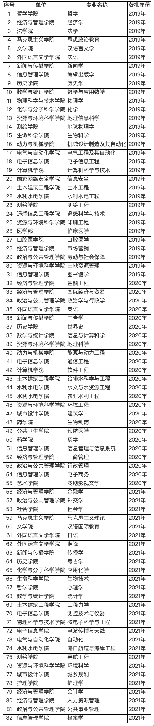 经过不懈努力,学校专业建设成绩斐然,2019-2021年新增10个国家战略急需、学科交叉融合专业;8个专业入选国家“强基计划”;11个专业入选国家基础学科拔尖学生培养计划2.0基地,入选总数居全国第四。学校充分发挥多学科优势,面向国家战略需求,积极开展新工科、新医科、新文科建设,推进弘毅学堂、特色软件示范学院、现代产业学院等教学综合改革试点学院建设,开设碳中和试验班、涉外法律人才试验班、全球治理与国际组织人才试验班及自强创业班等,探索人才培养新思路、新体制、新机制。
