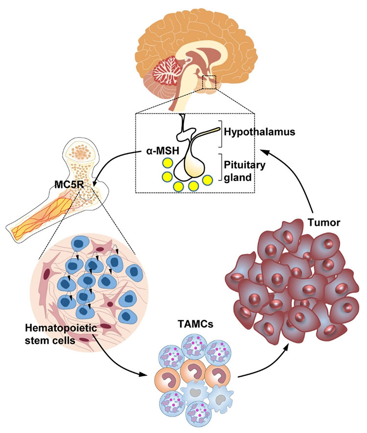 近日,中国科学技术大学生命科学与医学部周荣斌、江维教授团队与转化医学与创新药物国家重点实验室唐任宏团队合作,在Science以“First Release”的形式在线发表题为“Pituitary hormone α-MSH promotes tumor-induced myelopoiesis and immunosuppression”的“Research Article”研究论文,报道了下丘脑-垂体轴及其产生的激素α-MSH在介导肿瘤诱导的髓系造血和免疫抑制中的关键作用。