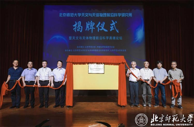 8月16日,北京师范大学天文与天体物理前沿科学研究所(以下简称“前沿所”)揭牌仪式暨天文与天体物理前沿科学高端论坛在昌平校园举行。北京师范大学党委书记程建平、校长马骏,国家天文台台长常进院士、国家自然科学基金委数理学部原常务副主任汲培文,中国科学院国家天文台党委书记汪洪岩,北京师范大学天文与天体物理前沿科学研究所负责人、中国科学院国家天文台武向平院士,中国科学院国家天文台汪景琇院士、中国科学院理论物理研究所所长蔡荣根院士、中国科学院紫金山天文台史生才院士、中国科学院南京天文光学技术研究所崔向群院士,北京师范大学副校长周作宇、康震等出席会议,来自全国有关天文单位和兄弟高校天文院所的领导和同仁近100人以线上线下形式参加会议。揭牌仪式由康震主持。