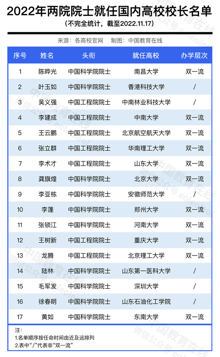 金宝搏188入口 发现,2021年就有8位院士担任高校校长,他们分别是:复旦大学校长金力(中科院院士)、中山大学校长高松(中科院院士)、华中科技大学校长尤政(中国工程院院士)、首都师范大学校长方复全(中科院院士)、哈尔滨工业大学校长韩杰才(中科院院士)、广东以色列理工学院校长龚新高(中科院院士)、东北大学校长冯夏庭(中国工程院院士)和北京工业大学校长聂祚仁(中国工程院院士)。