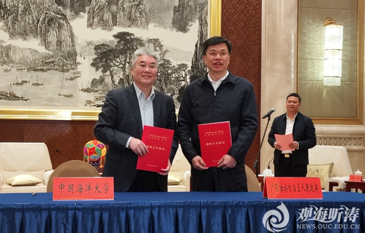 许永锞与于志刚共同签署《广西壮族自治区人民政府 中国海洋大学战略合作协议》。随后,许永锞、于志刚以及自治区海洋局局长蒋和生、党组书记贺志刚为双方共建的“向海经济发展研究中心”揭牌。