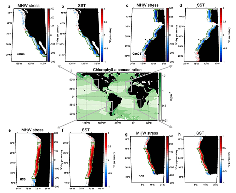 图1.东边界上升流系统海温和海洋热浪强度的未来变化趋势(相对于临近的开阔大洋)