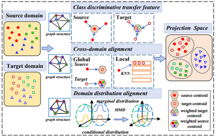 本论文提出了一种基于概率的图嵌入跨域对齐和类判别特征学习框架PGCD。一方面,PGCD在目标域为每个样本建立了与其对应的置信加权质心,构建了新的图嵌入结构,提升了迁移特征学习的准确性。另一方面,PGCD采用具有概率信息的新权重策略生成鲁棒性的质心,从源域到目标域、目标域到源域两个方向,构建了新的图嵌入结构,完成了对两个域的局部和全局结构的对齐。论文同时为新构建的图嵌入项给出了理论分析,进一步描述了域内和跨域迁移特征学习场景中样本间的关系。