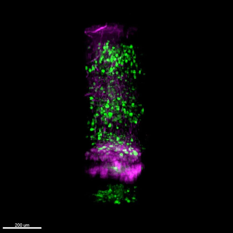 这一成像深度的突破得益于该显微镜全新的光学构型设计,使散射荧光收集效率实现了成倍提升。此外,该显微镜还可长时间、不间断地观测神经元功能活动而不产生明显的光漂白与光损伤。